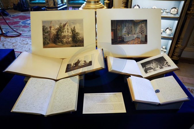 Items from a "Royal Collection Exhibition" relating to Germany on display, as German President Frank-Walter Steinmeier tours the Green Drawing Room at Windsor Castle, during his state visit to Britain, in Windsor, Britain, December 3, 2025. REUTERS/Hannah, Credit:Hannah McKay / Avalon