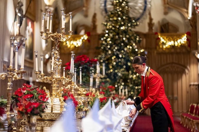 EMBARGOED TO 2000 WEDNESDAY DECEMBER 3 A member of Royal Household staff during table preparations before the state banquet for the German President Frank-Walter Steinmeier and his wife Elke Budenbender, at Windsor Castle, Berkshire, on day one of their state visit to the UK. Picture date: Wednesday December 3, 2025., Credit:Aaron Chown / Avalon