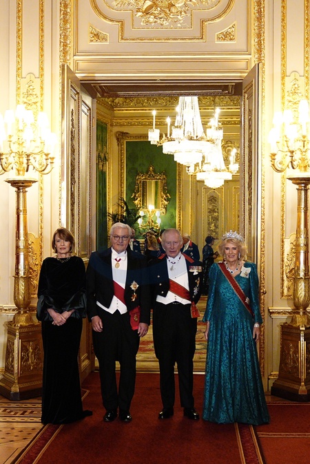 King Charles III and Queen Camilla (right) with German President Frank-Walter Steinmeier and his wife Elke Budenbender ahead of the state banquet for the German President and his wife, at Windsor Castle, Berkshire, on day one of their state visit to the UK. Picture date: Wednesday December 3, 2025., Credit:Aaron Chown / Avalon
