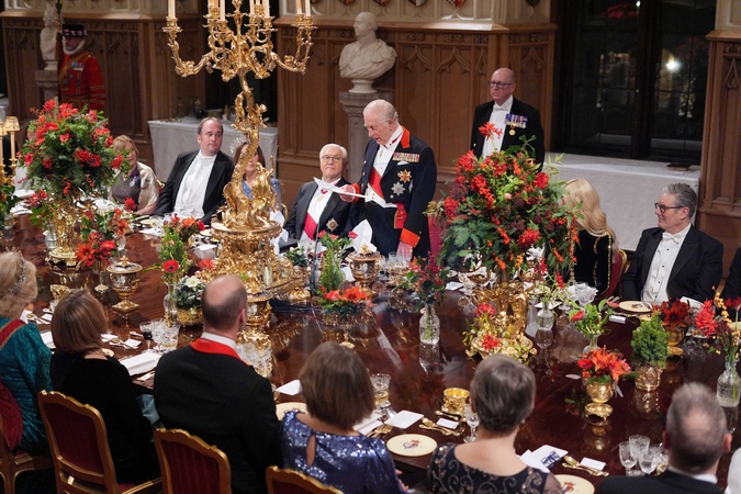 King Charles III speaking, with German President Frank-Walter Steinmeier (centre left), during the state banquet for the German President and his wife Elke Budenbender, at Windsor Castle, Berkshire, on day one of their state visit to the UK. Picture date: Wednesday December 3, 2025., Credit:Yui Mok / Avalon
