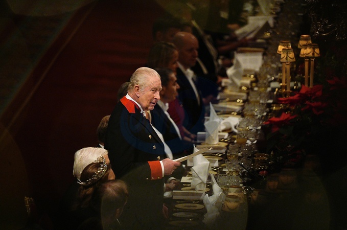 King Charles III speaking during the state banquet for the German President Frank-Walter Steinmeier and his wife Elke Budenbender, at Windsor Castle, Berkshire, on day one of their state visit to the UK. Picture date: Wednesday December 3, 2025., Credit:Aaron Chown / Avalon