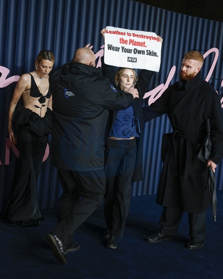 Protester attending The Fashion Awards 2025 at the Royal Albert Hall in Kensington, London, United Kingdom, Credit:Cat Morley / Avalon