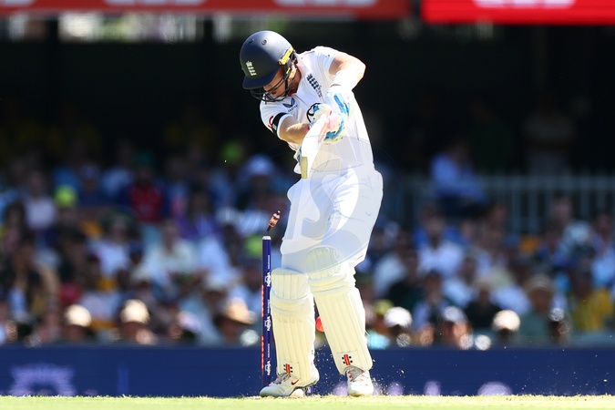 Ollie Pope of England gets bowled by Mitchell Starc of Australia during the NRMA Insurance Ashes Second Test Day 1 Series match Australia vs England at The Gabba, Brisbane Cricket Ground, Brisbane, United Kingdom, 4th December 2025, Credit:Patrick Hoelscher/News Images / Avalon