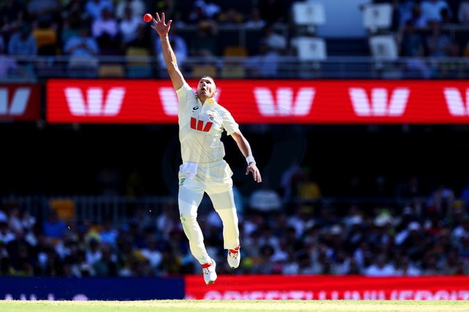 Scott Boland of Australia attempts a catch during the NRMA Insurance Ashes Second Test Day 1 Series match Australia vs England at The Gabba, Brisbane Cricket Ground, Brisbane, United Kingdom, 4th December 2025, Credit:Patrick Hoelscher/News Images / Avalon
