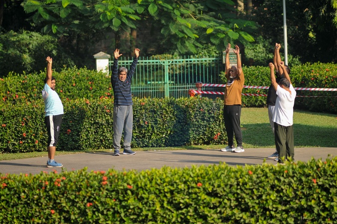 Chattogram, Bangladesh: Senior citizens gather for a group exercise routine on a sunny winter morning at the Chattogram War Cemetery Garden in Chattogram, Bangladesh, reflecting a growing emphasis on active ageing and community well-being., Credit:Md Rafayat Haque Khan / Avalon