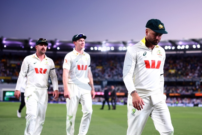Jake Weatherald of Australia, right, looks dejected during the NRMA Insurance Ashes Second Test Day 1 Series match Australia vs England at The Gabba, Brisbane Cricket Ground, Brisbane, Australia, 4th December 2025, Credit:Patrick Hoelscher/News Images / Avalon