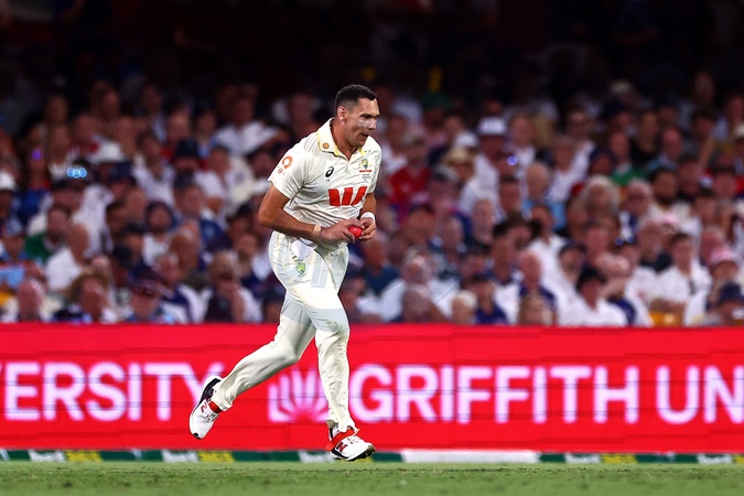 Scott Bland of Australia bowls during the NRMA Insurance Ashes Second Test Day 1 Series match Australia vs England at The Gabba, Brisbane Cricket Ground, Brisbane, Australia, 4th December 2025, Credit:Patrick Hoelscher/News Images / Avalon