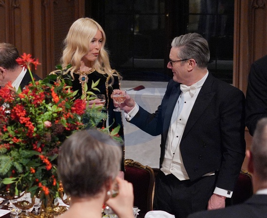 Guests, including Claudia Schiffer and Prime Minister Sir Keir Starmer, raise a toast during the state banquet for the German President Frank-Walter Steinmeier and his wife Elke Budenbender, at Windsor Castle, Berkshire, on day one of their state visit to the UK. Picture date: Wednesday December 3, 2025., Credit:Avalon.red / Avalon