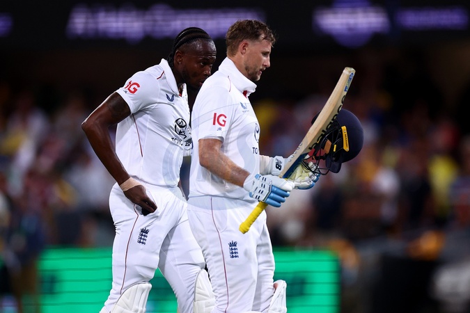 Joe Root of England and Jofra Archer of England exit the field during the NRMA Insurance Ashes Second Test Day 1 Series match Australia vs England at The Gabba, Brisbane Cricket Ground, Brisbane, Australia, 4th December 2025, Credit:Patrick Hoelscher/News Images / Avalon