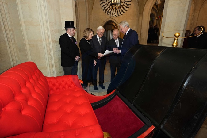 RETRANSMITTING AMENDING LEFT TO RIGHT (from second left to right) Elke Budenbender, German President Frank-Walter Steinmeier and King Charles III viewing an illustration of the State Sleigh (in foreground) - which was designed by Queen Victoria's German-born husband Prince Albert and recorded in Victoria's diary in 1845 - before they depart from Windsor Castle, Berkshire, on day two of the state visit to the UK by the President of the Federal Republic of Germany. Picture date: Thursday December 4, 2025., Credit:Avalon.red / Avalon