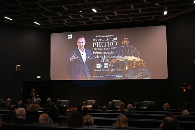 Press preview for Benigni's television show "Pietro, a Man in the Wind," a monologue dedicated to the history of St. Peter's. Pictured is the poster and the auditorium. Rome, Maxxi Auditorium. Rai Cultura. Dec 4th 2025, Credit:Maria Laura Antonelli / Avalon