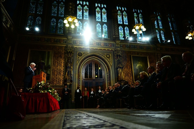 President of the Federal Republic of Germany Frank-Walter Steinmeier addresses members of the House of Lords and the House of Commons in the Royal Gallery at the Palace of Westminster.President of the Federal Republic of Germany Frank-Walter Steinmeier State Visit, Day 2, Address to Parliament, Palace of Westminster, London, UK - 04 Dec 2025, Credit:Victoria Jones/Shutterstock / Avalon