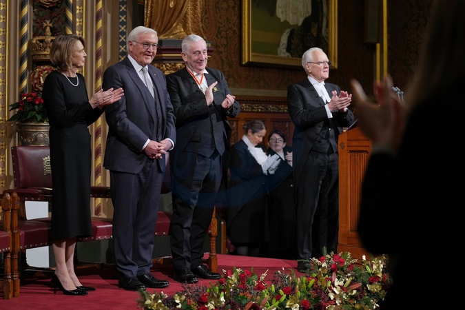 German President Frank-Walter Steinmeier, center, acknowledges the applause after speaking to a joint session of Members of Parliament, with his wife Elke Budenbender, left and the Speaker of the House of Commons, Lindsay Hoyle, in the Royal Gallery, at the Palace of Westminster, as part of his State Visit to the United Kingdom, in London, Thursday, Dec. 4, 2025., Credit:Kin Cheung / Avalon
