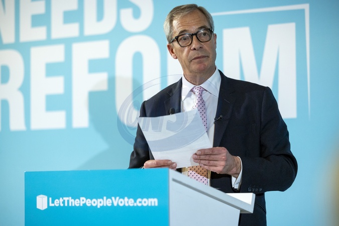 Nigel Farage MP spoke at a Reform UK press conference in Westminster, responding to the cancellation of upcoming elections. The Labour government plans to delay Mayoral elections in Essex, Hampshire and the Solent, Sussex and Brighton, and Norfolk and Suffolk by at least two years., Credit:Abdullah Bailey / Avalon