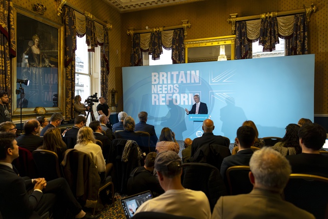 Nigel Farage MP spoke at a Reform UK press conference in Westminster, responding to the cancellation of upcoming elections. The Labour government plans to delay Mayoral elections in Essex, Hampshire and the Solent, Sussex and Brighton, and Norfolk and Suffolk by at least two years., Credit:Abdullah Bailey / Avalon