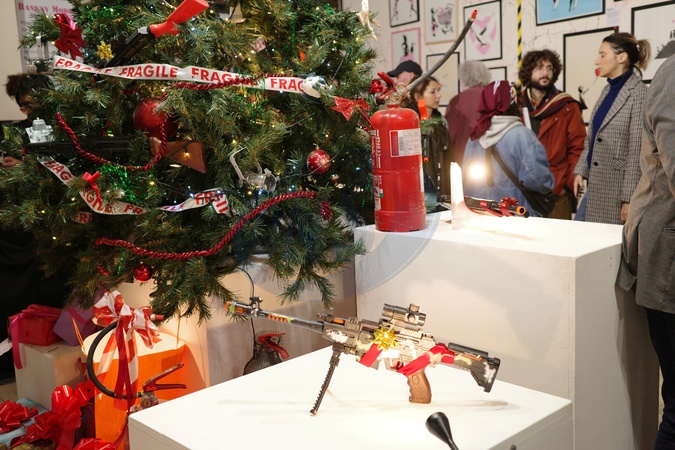 December 3, 2025, Agrigento. Authorities and the public attend the inauguration of the "Banksy Modeste Collection" exhibition at the Agrigento Chamber of Commerce. Pictured is a gift-wrapped fake machine gun, part of the Christmas display. Agrigento. Italy 03 December 2025, Credit:Christian Bonaviri / Avalon