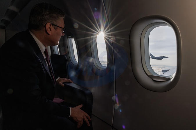 04/12/2025. London, United Kingdom. Prime Minister Keir Starmer views a Typhoon escorting his flight from the plane window while he travels with Norwegian Prime Minister Jonas Gahr Støre to visit RAF Lossiemouth as the UK and Norway will operate together to counter Russian undersea threat through a major new defence agreement., Credit:Lauren Hurley / Avalon