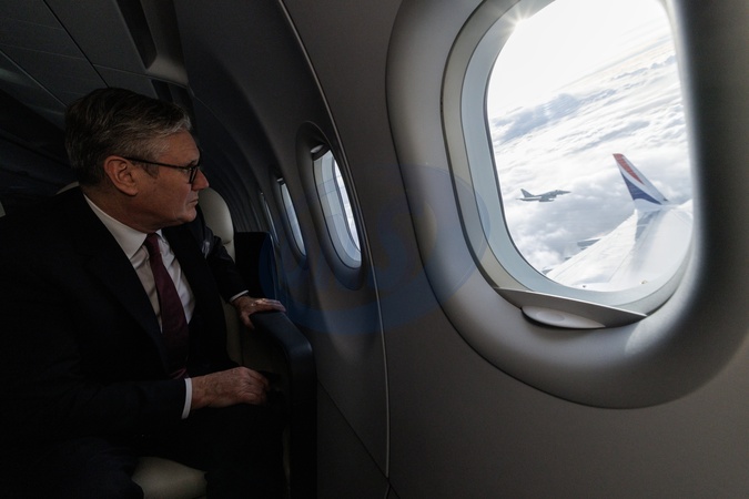 04/12/2025. London, United Kingdom. Prime Minister Keir Starmer views a Typhoon escorting his flight from the plane window while he travels with Norwegian Prime Minister Jonas Gahr Støre to visit RAF Lossiemouth as the UK and Norway will operate together to counter Russian undersea threat through a major new defence agreement., Credit:Lauren Hurley / Avalon
