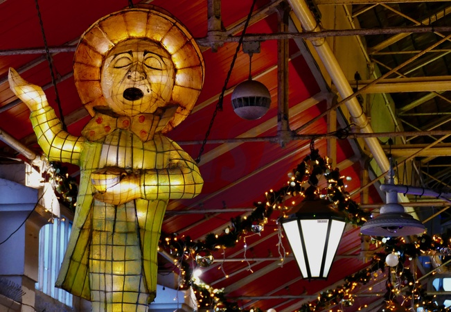 Oxfords historic Covered Market at Christmas. The Covered Market is a historic market with permanent stalls and shops in a large covered structure in central Oxford, England. It was designated a Grade II listed building in 2000, at Christmas Alice In Wonderland figures are illuminated and independent shops are decked out in festive themes. Since its opening in 1774, with its initial 20 butchers' shops, the Covered Market has been an architectural and cultural landmark., Credit:Geoffrey Swaine / Avalon