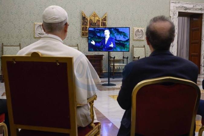 Apostolic Palace. Pope Leo XIV met with Roberto Benigni for the monologue "Peter, a Man in the Wind," which will be broadcast on Rai1 on December 10th in prime time and which had its world premiere this morning at the MAXXI Museum in Rome. The Pope watched excerpts from the monologue: "How beautiful, it's about love," he commented afterward. During the meeting, before the screening, the Pope and Benigni discussed cinema and "Life is Beautiful," which the Pope listed among his four favorite films. Vatican City, Italy 04 December 2025, Credit:Vatican Media / Avalon