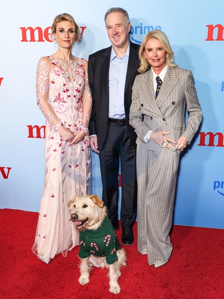 CULVER CITY, LOS ANGELES, CALIFORNIA, USA - DECEMBER 04: British playwright, theatre director and screenwriter Jessica Swale, Matthew Baer, Irish actress, producer, and author Roma Downey and Gus the Dog arrive at the Los Angeles Special Screening Of Amazon Prime Video's 'Merv' held at The Culver Theater on December 4, 2025 in Culver City, Los Angeles, California, United States., Credit:Xavier Collin / Avalon