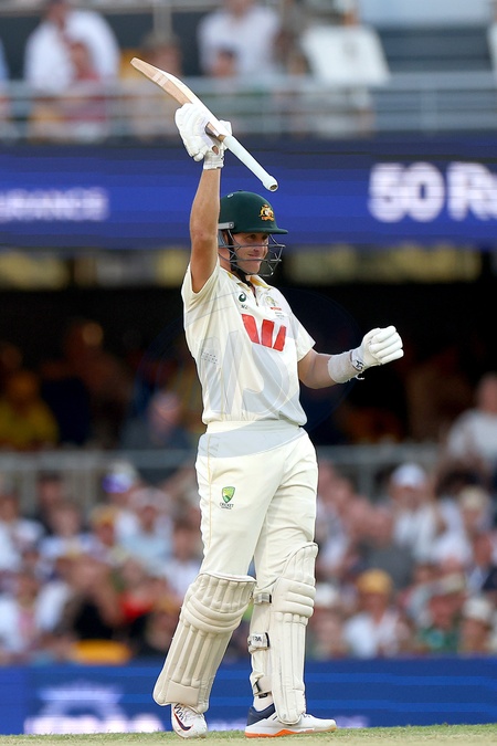 Marnus Labushchagne of Australia celebrates reaching his half-century during the NRMA Insurance Ashes Second Test Day 2 Australia vs England at The Gabba, Brisbane Cricket Ground, Brisbane, Australia, 5th December 2025, Credit:Pat Hoelscher/News Images / Avalon