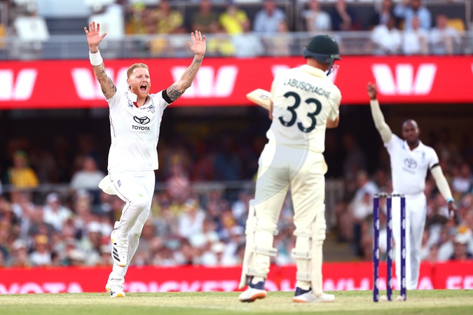 Ben Stokes of England dismisses Marnus Labushchagne of Australia during the NRMA Insurance Ashes Second Test Day 2 Australia vs England at The Gabba, Brisbane Cricket Ground, Brisbane, Australia, 5th December 2025, Credit:Pat Hoelscher/News Images / Avalon