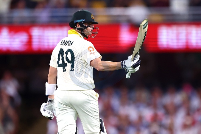 Steve Smith of Australia celebrates reaching his half-century during the NRMA Insurance Ashes Second Test Day 2 Australia vs England at The Gabba, Brisbane Cricket Ground, Brisbane, Australia, 5th December 2025, Credit:Pat Hoelscher/News Images / Avalon