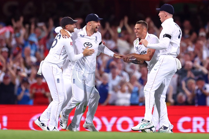 Will Jacks of England celebrates the dismissal of Steve Smith of Australia during the NRMA Insurance Ashes Second Test Day 2 Australia vs England at The Gabba, Brisbane Cricket Ground, Brisbane, Australia, 5th December 2025, Credit:Pat Hoelscher/News Images / Avalon