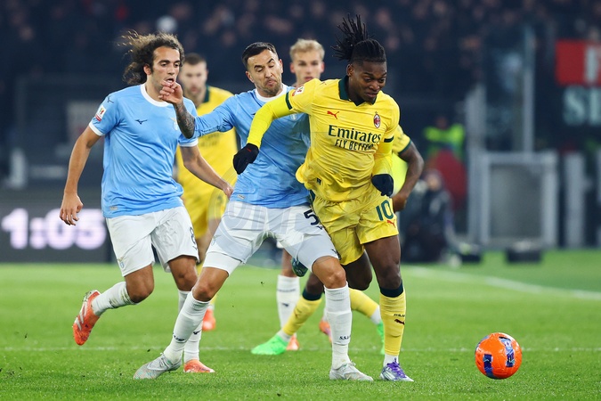 2025-26 Coppa Italia round of 16 Lazio-Milan, pictured: Matias Vecino and Rafael Leao clash Rome, Olympic stadium, Dec 4th 2025, Credit:/AGF / Avalon