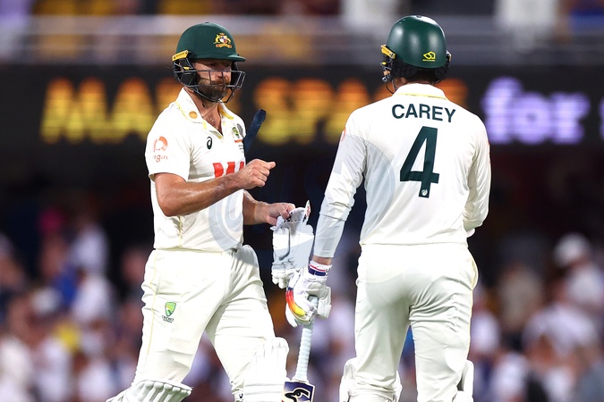 Michael Neser of Australia and Alex Carey of Australia are seen at stumps during the NRMA Insurance Ashes Second Test Day 2 Australia vs England at The Gabba, Brisbane Cricket Ground, Brisbane, Australia, 5th December 2025, Credit:Pat Hoelscher/News Images / Avalon