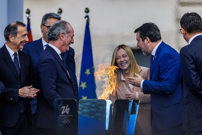 Inauguration Ceremony of the Olympic Torch Relay Journey. Pictured are Prime Minister Giorgia Meloni, Minister of Infrastructure and Transport Matteo Salvini, and Luca Zaia. Rome, Dec 5th 2025, Credit:/AGF / Avalon