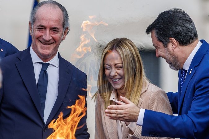 Inauguration Ceremony of the Olympic Torch Relay Journey. Pictured are Prime Minister Giorgia Meloni, Minister of Infrastructure and Transport Matteo Salvini, and Luca Zaia. Rome, Dec 5th 2025, Credit:/AGF / Avalon