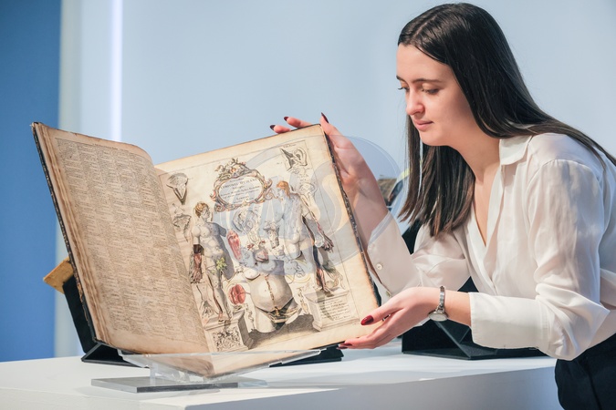 London, UK. 05th Dec, 2025. Christie's staff with a hand-coloured Restoration-era pop-up anatomy, with presentation leaf to Nell Gwyn. Estimate: £15,000–20,000. Christie's Valuable Books & Manuscripts sale, part of Classic Week, will be on 10 December, 2025., Credit:Imageplotter / Avalon