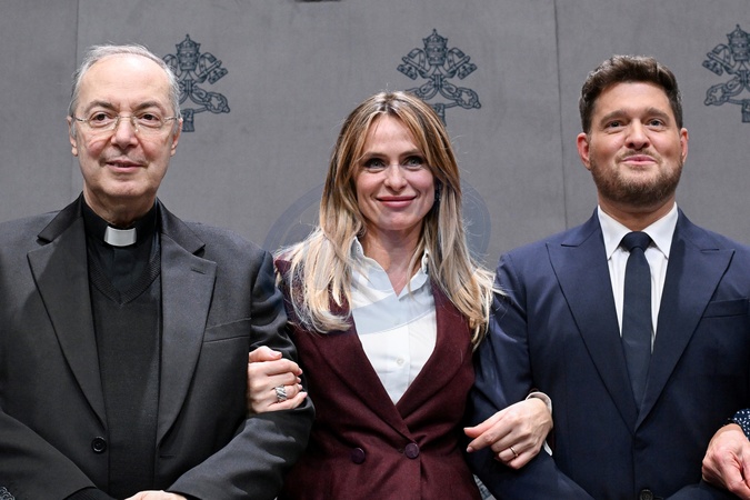 Press conference for the "Concert with the Poor." Pictured are Don Marco Frisina, Serena Autieri, and Michael Bublè. Vatican City, Dec 5th, 2025, Credit:Maria Laura Antonelli/AGF / Avalon