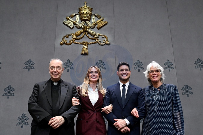 Press conference for the "Concert with the Poor." Pictured are Serena Autieri, Father Marco Frisina, Michael Buble, and Christiane Murray. Vatican City, Dec 5th, 2025, Credit:Maria Laura Antonelli/AGF / Avalon