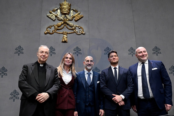 Press conference for the "Concert with the Poor." Pictured are Serena Autieri, Father Marco Frisina, and Michael Bublé. Vatican City, Dec 5th, 2025, Credit:Maria Laura Antonelli/AGF / Avalon
