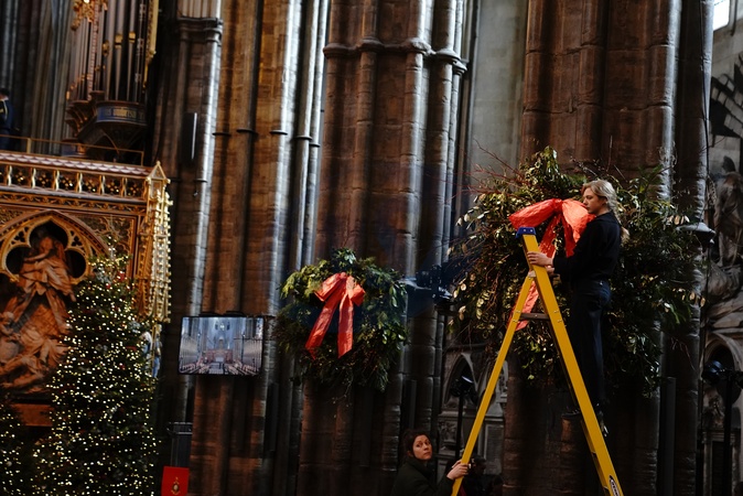 Decorators put up wreaths in the Abbey ahead of the Together At Christmas carol service at Westminster Abbey in London. Picture date: Friday December 5, 2025., Credit:Aaron Chown / Avalon