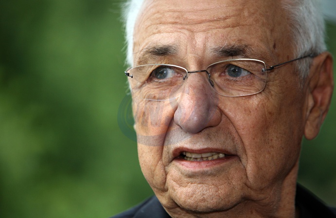 Architect Frank Gehry on the roof of the Serpentine Gallery overlooking the roof canopy of the pavilion which he designed in London's Hyde Park today, July 9th, 2008. The roof canopy, comprising of large timber planks and multiple glass planes, will open to the public on Sunday 20th July., Credit:Susannah Ireland / Avalon