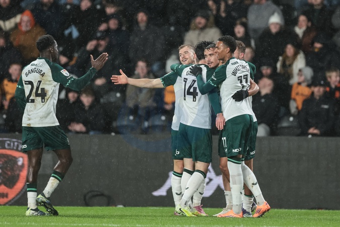 David Strelec of Middlesbrough celebrates his goal to make it 0-1 with team mates during the Sky Bet Championship match Hull City vs Middlesbrough at MKM Stadium, Hull, United Kingdom, 5th December 2025, Credit:Mark Cosgrove/News Images / Avalon