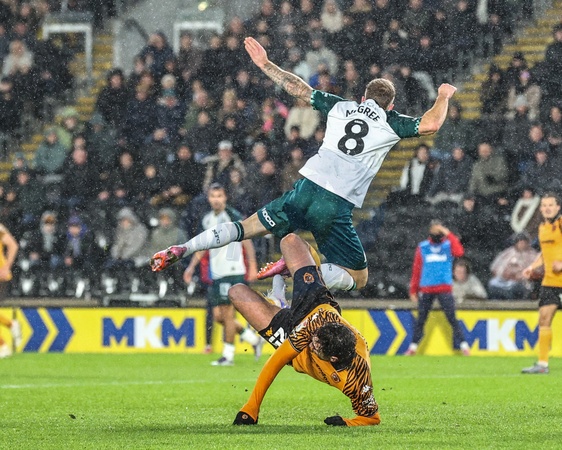 Riley McGree of Middlesbrough is fouled by Matt Crooks of Hull City during the Sky Bet Championship match Hull City vs Middlesbrough at MKM Stadium, Hull, United Kingdom, 5th December 2025, Credit:Ae Cosgrove/News Images / Avalon