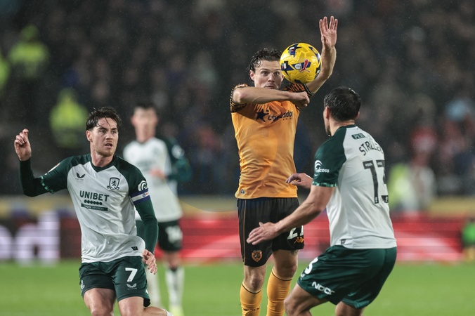 Regan Slater of Hull City jumps up to win the high ball from David Strelec of Middlesbrough during the Sky Bet Championship match Hull City vs Middlesbrough at MKM Stadium, Hull, United Kingdom, 5th December 2025, Credit:Mark Cosgrove/News Images / Avalon