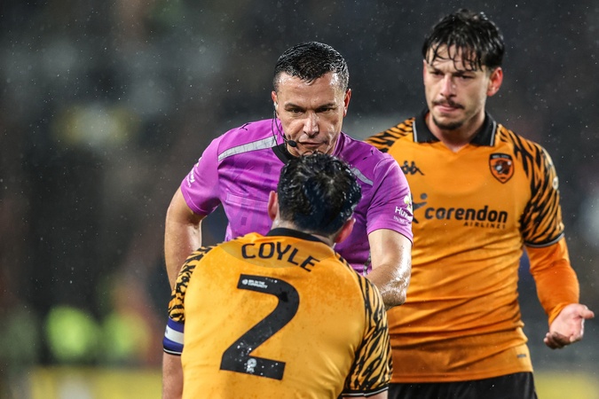 Referee Dean Whitestone gives instructions to Lewis Coyle of Hull City during the Sky Bet Championship match Hull City vs Middlesbrough at MKM Stadium, Hull, United Kingdom, 5th December 2025, Credit:Ae Cosgrove/News Images / Avalon