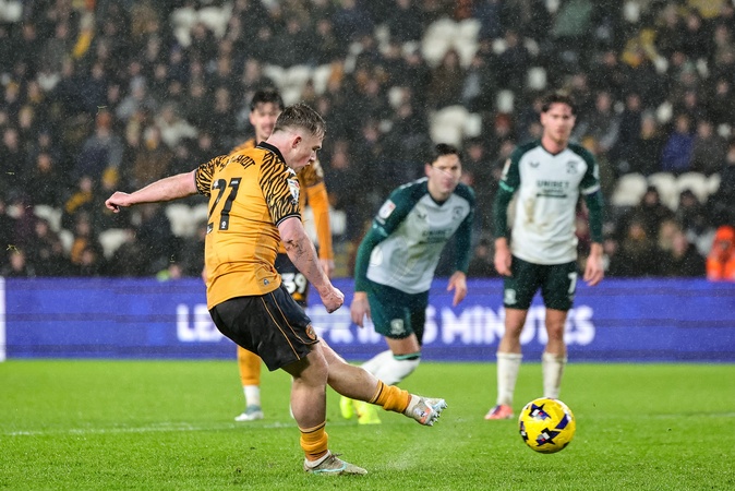Joe Gelhardt of Hull City scores a penalty to make it 1-4 during the Sky Bet Championship match Hull City vs Middlesbrough at MKM Stadium, Hull, United Kingdom, 5th December 2025, Credit:Mark Cosgrove/News Images / Avalon