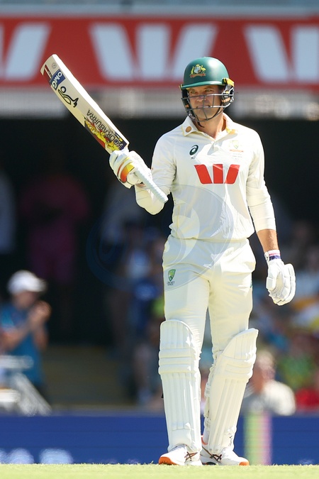 Alex Carey of Australia celebrates reaching his half-century during Day 3 of the Second Test in the NRMA Insurance Ashes Series Australia vs England at The Gabba, Brisbane Cricket Ground, Brisbane, Australia, 6th December 2025, Credit:Patrick Hoelscher/News Images / Avalon