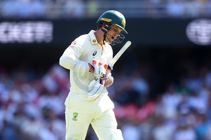 Alex Carey of Australia is dismissed by Gus Atkinson of England during Day 3 of the Second Test in the NRMA Insurance Ashes Series Australia vs England at The Gabba, Brisbane Cricket Ground, Brisbane, Australia, 6th December 2025, Credit:Patrick Hoelscher/News Images / Avalon