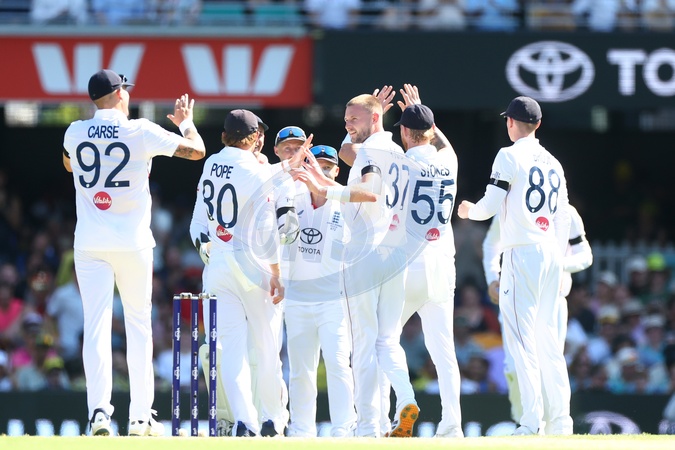 Alex Carey of Australia is dismissed by Gus Atkinson of England during Day 3 of the Second Test in the NRMA Insurance Ashes Series Australia vs England at The Gabba, Brisbane Cricket Ground, Brisbane, Australia, 6th December 2025, Credit:Patrick Hoelscher/News Images / Avalon