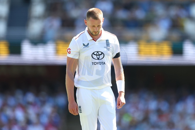 Gus Atkinson of England looks on during Day 3 of the Second Test in the NRMA Insurance Ashes Series Australia vs England at The Gabba, Brisbane Cricket Ground, Brisbane, Australia, 6th December 2025, Credit:Patrick Hoelscher/News Images / Avalon