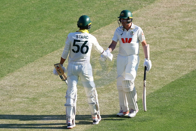 Mitchell Starc of Australia celebrates his half century during Day 3 of the Second Test in the NRMA Insurance Ashes Series Australia vs England at The Gabba, Brisbane Cricket Ground, Brisbane, Australia, 6th December 2025, Credit:Patrick Hoelscher/News Images / Avalon