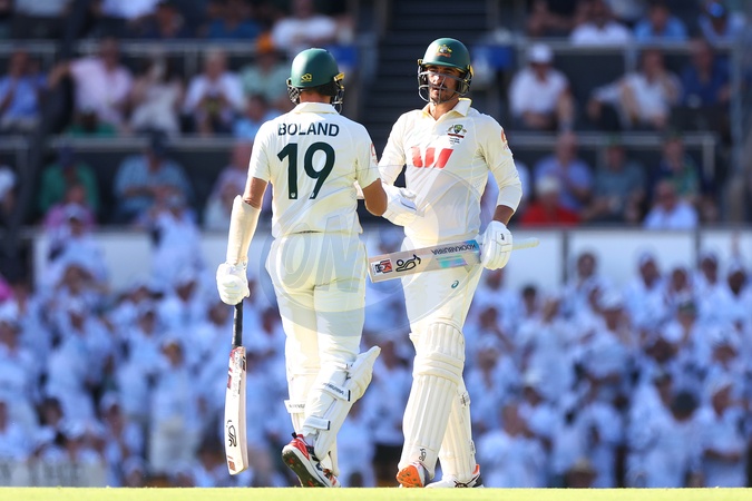 Mitchell Starc of Australia and Scott Boland of Australia are seen during Day 3 of the Second Test in the NRMA Insurance Ashes Series Australia vs England at The Gabba, Brisbane Cricket Ground, Brisbane, Australia, 6th December 2025, Credit:Patrick Hoelscher/News Images / Avalon